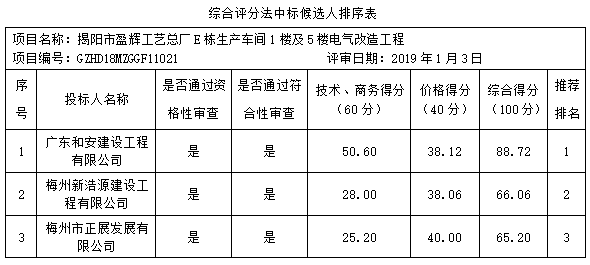广州宏达工程顾问集团有限公司(以下简称“招标代理机构”)受揭阳市盈辉工艺总厂(以下简称“招标人”)的委托,于2019年1月3日就揭阳市盈辉工艺总厂E栋生产车间1楼及5楼电气改造工程(项目编号GZHD18MZGGF11021)采用公开招标方式进行采购。现就本次招标的中标结果公告如下: 一、招标人名称:揭阳市盈辉工艺总厂 二、项目名称:揭阳市盈辉工艺总厂E栋生产车间1楼及5楼电气改造工程 三、项目编号:GZHD18MZGGF11021 四、招标方式:公开招标 五、招标项目简要说明:(包括内容、简要技术要求、合同履行日期等) 1、项目内容:揭阳市盈辉工艺总厂E栋生产车间1楼及5楼电气改造工程; 2、简要技术要求、合同履行日期:详见招标文件用户需求。 六、招标公告日期及媒体:招标代理机构于2018年12月10日在公开的媒体广州宏达工程顾问集团有限公司(http://www.wangtat.com.cn/)、中国采购与招标网(http://www.chinabidding.com.cn/)上发布了招标公告。 七、评审信息: 1、评审日期:2019年1月3日 2、评审地点:梅州市梅江区客都大道东汇城写字楼D2栋10楼1006号(广州宏达工程顾问集团有限公司梅州分公司) 3、评标委员会负责人:潘廷 4、评标委员会其他成员:蔡坚、陈志年、朱志勇、钟辉 八、评审结果详情如下: ![]() 九、中标信息: 1、中标人名称:广东和安建设工程有限公司 2、法人代表:管剑开 3、中标人地址:梅州市梅县区程江镇宪梓大道(和安大厦) 4、中标金额(人民币):伍拾玖万玖仟捌佰捌拾元零捌分(¥599,880.08) 十、本公告期限1个工作日。 十一、联系事项: 1、招标人联系方式 招标人名称:揭阳市盈辉工艺总厂 招标人地址:广东省揭阳市揭东区玉窖镇 2、招标代理机构名称:广州宏达工程顾问集团有限公司 招标代理机构联系地址:梅州市梅江区客都大道东汇城写字楼D2栋D2-1006号 项目联系人:卓先生 招标项目联系电话:0753-2259923 招标代理机构传真:0753-2251923 此中标公告即为招标结果通知书。如果投标人对此结果有异议的,可以在中标公告发布之日起七个工作日内以书面形式向我公司提出质疑,质疑函中应明确权益受到损害的事实与理由。逾期将依法不予受理。 特此通知! 广州宏达工程顾问集团有限公司 2019年1月4日 |